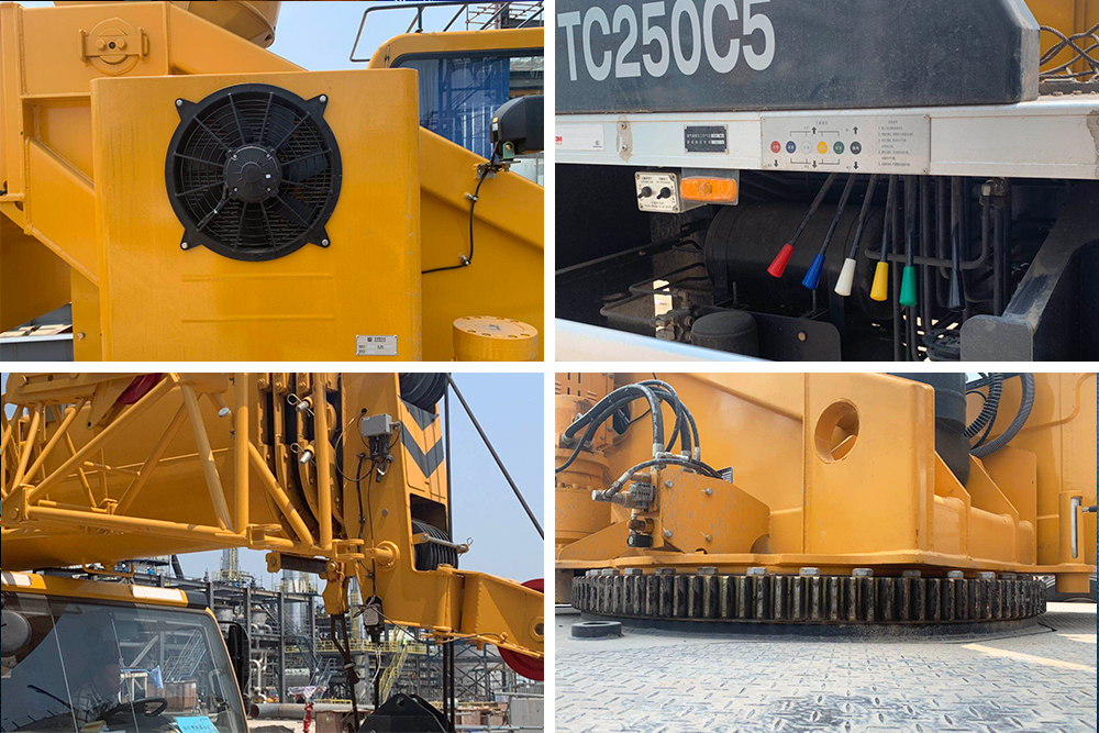 經實測,TC250C5垂直支腿全收/放時間26/24s,水平支腿全收/放時間19/17s,效率極高,轉場十分靈活;起重臂全伸/縮時間87/103s,起重臂全起/落時間37/56s。