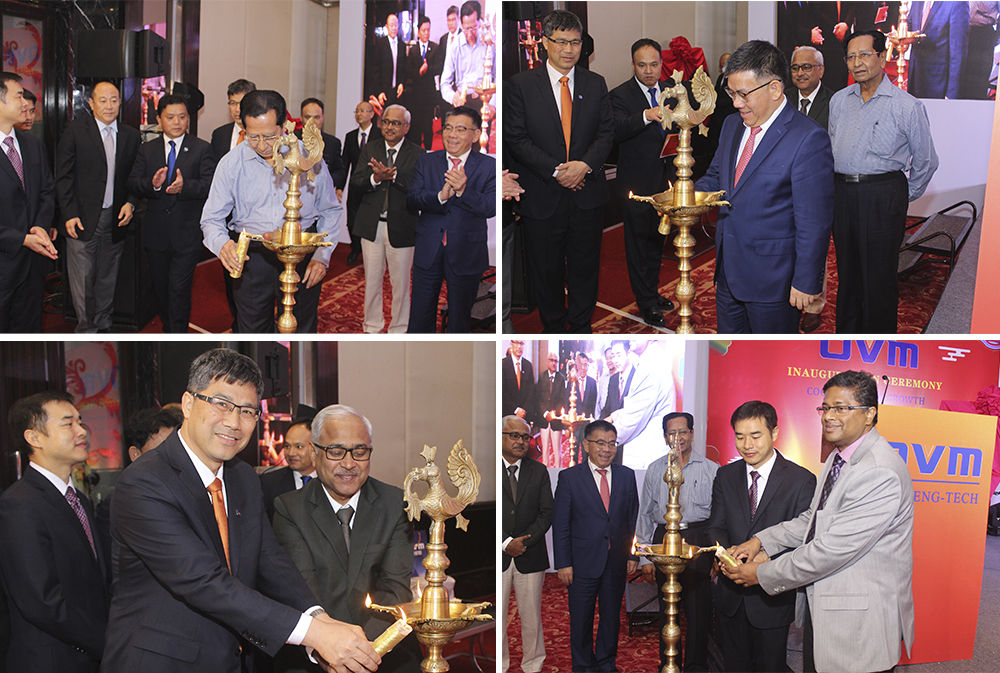 在富有濃郁傳統印度特色的燃燈儀式上,年屆82歲高齡、有印度預應力行業大師之稱的Mr. P. Y. Manjure率先用手中的蠟燭點燃了油燈燈芯,然后其它特邀嘉賓依次傳遞,分別點亮所有燈芯。點亮的神燈代表著祝福,預示印度歐維姆的明天將更加光明。在熱烈的掌聲中,柳工集團黨委書記、董事長曾光安與Mr. Atul Bhobe(Managing Director of TPF Engineering Pvt., Ltd)共同為印度歐維姆揭牌。