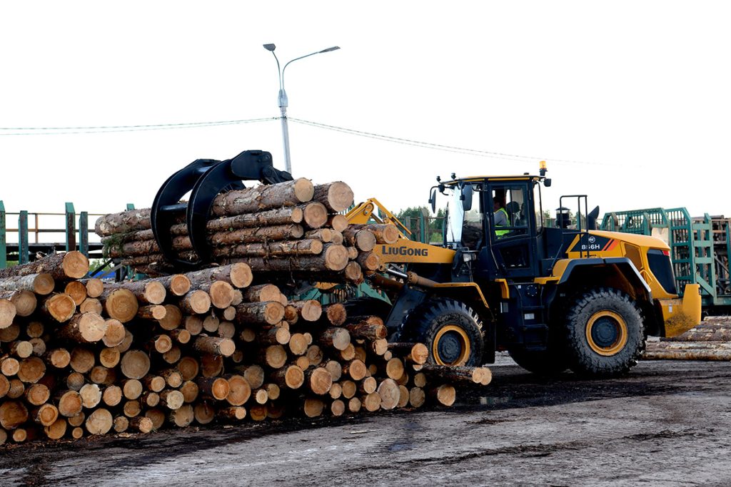 進(jìn)入普列謝茨克,仿佛來到了森林王國,穿過一片又一片筆直的樹林,我們終于看到正在進(jìn)行木材轉(zhuǎn)運(yùn)和裝車作業(yè)的柳工裝載機(jī)、挖掘機(jī)。只見配置抱叉屬具的柳工856HMAX裝載機(jī)將原木堆放成整齊的“小山”,柳工922E挖掘機(jī)嫻熟地將7-8根原木抓起,裝入旁邊專門運(yùn)送木材的火車車廂,只需幾分鐘就能裝滿一車廂。